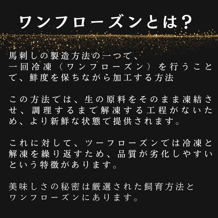 ●ワンフローズン製法:生の馬肉をそのまま加工し凍結させました。解凍する工程がないため、より鮮度の良い状態でお届けすることができます。