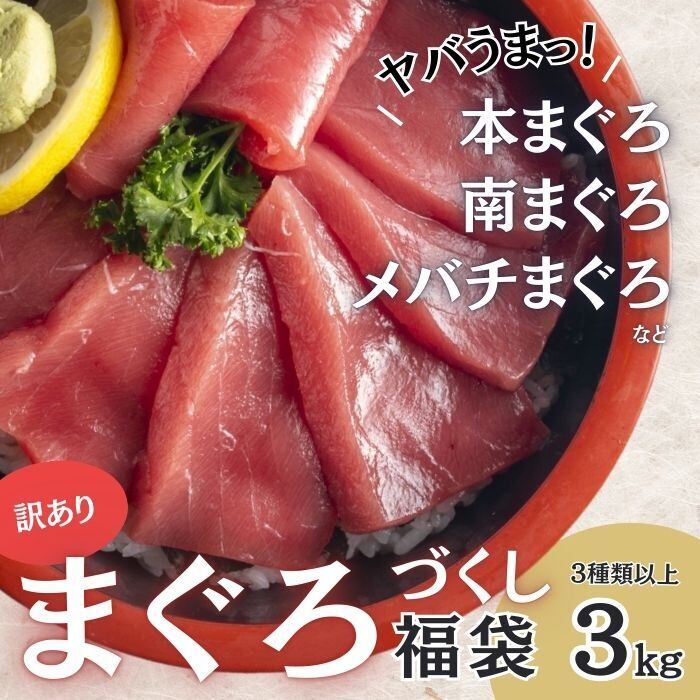 まぐろ3種3kg以上 詰合せセット (中トロ/赤身・テール・カマ・ほほ肉(目玉付):本鮪・南鮪・きはだ鮪等々)
