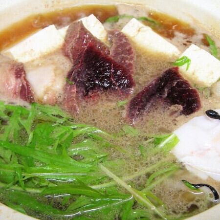 出汁が煮たったら鯨肉(スライス済み)と水菜を加え(お好みで豆腐やエノキ、油揚げなどを加え)、軽く火が通ったらお召し上がりください。(鯨肉に火が通りすぎると硬くなるのでご注意下さい)