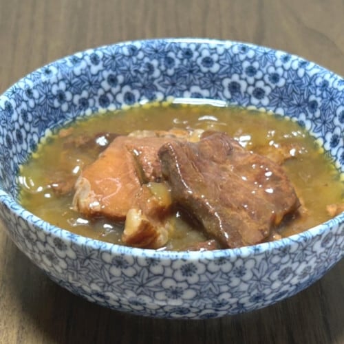●鯨肉ならではのしっかりとした味わいを活かし、醤油味ベースで甘辛く煮込まれています。