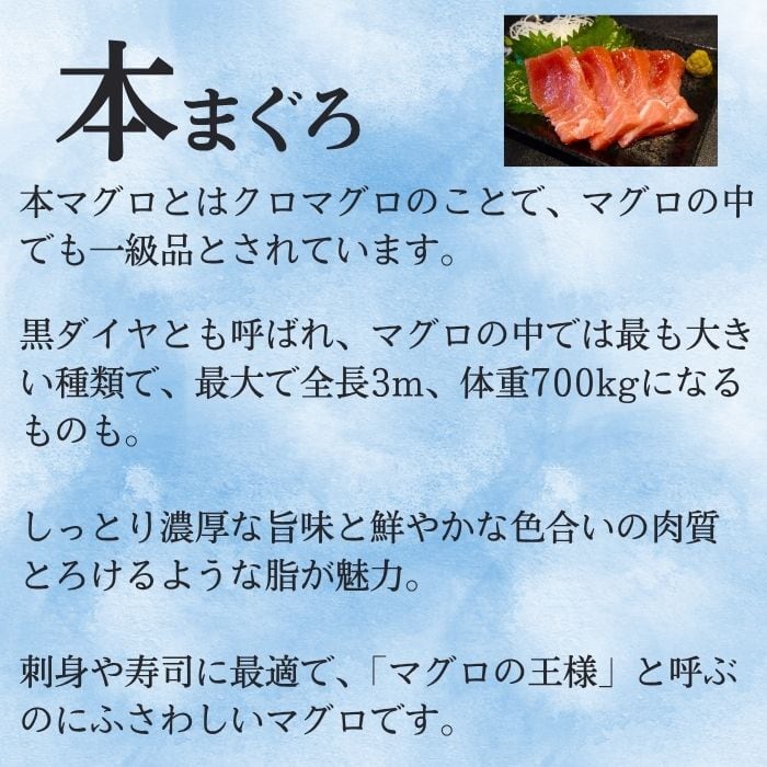 本マグロは日本の代表的なマグロでクロマグロとも呼ばれます。