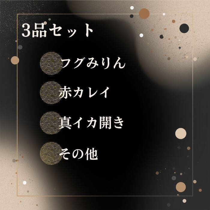 ●内容は、人気の干物(ふぐ・赤魚・剣いか)の3品を厳選しました。地元の風味をそのままお楽しみいただけます。