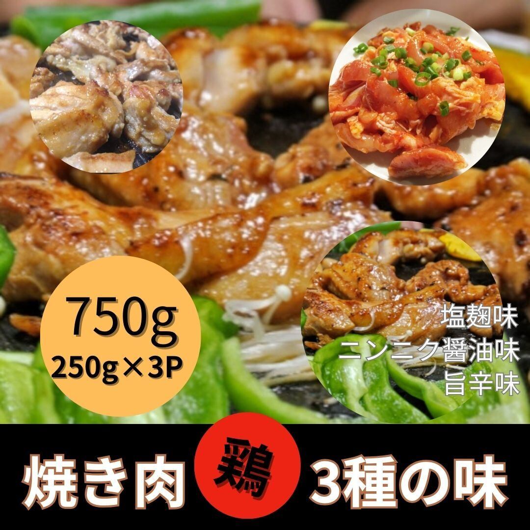【750g】焼き肉 国産鶏3種(250g×3P)(旨辛味・塩麹味・ニンニク醤油味)